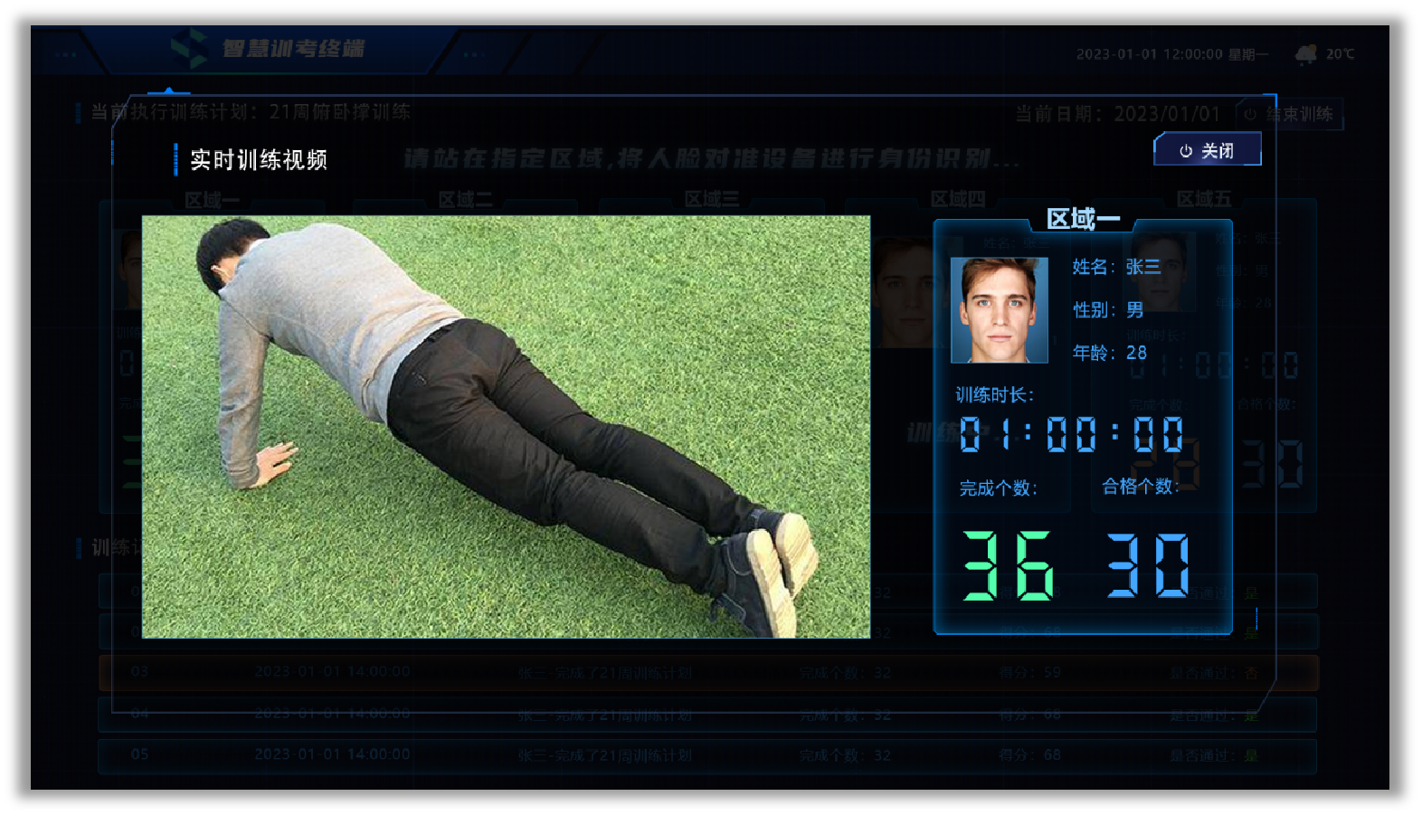 基于纯视觉AI算法实现人体动作捕捉和行为分析,按照《考核大纲》,自动判定各训练动作是否符合标准,自动计算成绩和排名,对错误动作不记录成绩,提示错误原因。